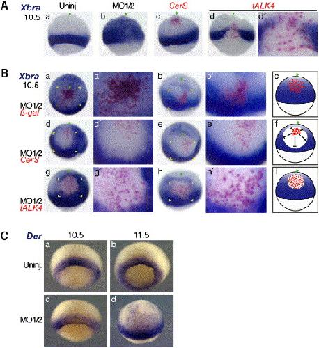 Fig. 7. Evidence for the expansion of Xbra expression by long-range Xnr signaling after Xatv knockdown. (A) In situ hybridization with Xbra on embryos at St. 10.5. (a) Uninjected embryo. (b) XatvMO1 + MO2-injected embryo. (c) CerS-injected embryos. (d) tALK4-injected embryo. (d′) High magnified view of panel d. (a–d) Lateral views. Red-gal staining in panels c and d detects the descendents of the cell injected with CerS and tALK4, respectively. (B) Xnr-specific inhibitors prevent ectopic Xbra expression in Xatv-deficient embryos. In situ hybridization on embryos at St. 10.5 detects Xbra expression, with red-gal staining detecting the descendants of the cell injected with RNA encoding the inhibitor (see text for detailed experimental design). Injection of β-gal (250 pg) does not affect ectopic Xbra expression (a–b′). CerS (500 pg) inhibits ectopic Xbra expression non-cell autonomously (d–e′), whereas tALK4 (500 pg) suppresses the ectopic Xbra expression cell autonomously (g–h′). (c, f, i) Simplified diagrams showing the effects on ectopic Xbra expression by β-gal, CerS, and tALK4, respectively. Red dots represent the clone of cells that express β-gal, CerS, and tALK4, respectively. “⊥” symbols in panels f and i show inhibition of Xnr signaling non-cell and cell autonomously by CerS and tALK4, respectively. (a, e) Animal views. (b, d, g, h) Lateral views skewed ∼45° animal-ward. (a′, b′, d′, e′, g′, h′) Magnified views of the yellow bracketed area of panels a, b, d, e, g, and h, respectively. Green arrowheads in panels A and B indicate animal pole. (C) In situ hybridization with Der in (a, b) uninjected and (c, d) XatvMO1 + MO2-injected embryos. Dorsal views, with (d) angled downward slightly to visualize the animal-ward extent of Der signal. |