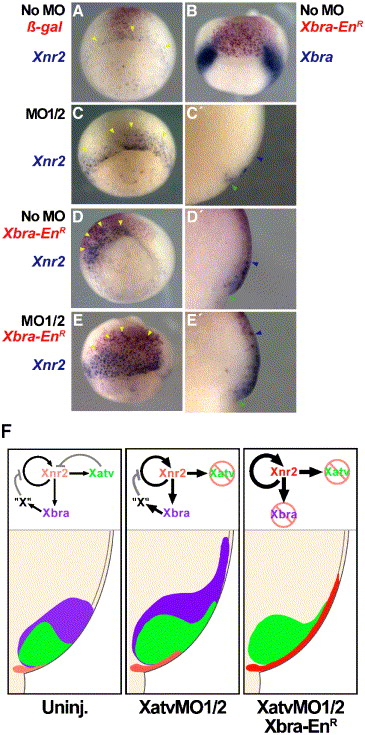 Fig. 8. Xatv and Xbra synergistically restrict the Xnr expression domain. Xbra-EnR RNA (1 ng) was injected ∼45° above the equator into one blastomere of 4-cell stage embryos that previously received 30 ng each of (XatvMO1 + XatvMO2) at the 1-cell stage. β-gal RNA (400 pg) was coinjected with Xbra-EnR RNA as lineage tracer. Xnr2 and Xbra expression was analyzed by in situ hybridization at St. 10.5 after red-gal staining. (A) Xnr2 expression, uninjected embryo. Red-gal staining indicates descendants of the β-gal-injected cell. (B) Xbra expression, Xbra-EnR RNA-injected embryo. (C) Xnr2 expression, XatvMO1 + MO2-injected embryo. (D) Xnr2 expression, Xbra-EnR RNA-injected embryo. (E) Xnr2 expression, XatvMO1 + MO2 and Xbra-EnR RNA-injected embryo. (C′, D′, E′) Embryos bisected through the center of the Xnr2 expression domain along animal-vegetal axis (from C, D and E). Green arrowheads, dorsal lip; blue arrowheads, anterior/animal boundary of Xnr2 expression; yellow arrowheads in panels A, C, D, E—approximate animal limit of Xnr2 expression domain. Note that Xnr2 expression remains in the superficial layer. Black print: injection or uninjection of XatvMO1 + MO2 (MO1/2); red print: reagents coinjected with the β-gal lineage tracer, except (A); blue print: probes used for in situ hybridization. (F) Model of synergistic Xatv/Xlefty and Xbra-mediated restriction of Xnr expression during gastrulation. Schematic diagrams represent dorsal midline-bissected stage 10.5 early gastrulae, showing internal expression domains of Xnr2 (red), Xatv (green), and Xbra (purple) in embryos that are (left) normal uninjected, (middle) Xatv/Xlefty MO1/MO2-coinjected, or (right) MO1/MO2 coinjected with Xbra-EnR. Increased line weight of arrows indicates elevated Xnr signaling, and increasing color intensity from light to dark red indicates increasing Xnr2 expression intensity. In normal embryos, Xnr2 expression is tightly restricted to the superficial layer of the dorsal lip (indentation), with Xnr–Xnr autoregulation maintaining this territory. Xnr2 restriction is accomplished by both Xatv and Xbra, activated by Xnr signaling diffusing from the Xnr2 expression domain. Primarily, Xatv inhibits Xnr expression non-cell autonomously. Xnr diffusing from producing cells activates expression of Xbra (purple) in both deep and superficial layers, which is stronger and earlier in the deep marginal zone compared to the superficial layer (see text). Rapid activation of Xbra provides an indirect repressive influence (Xbra is a transcriptional activator), implying that an unknown “Factor X” inhibits Xnr autoregulation, leading to the fixing of mutually exclusive expression domains for Xnr2 and Xbra. Knockdown of Xatv function using Xatv/Xlefty MO1 + MO2 allows limited expansion of Xnr2 expression, but elevated Xnr signaling range causes the massive expansion of Xatv and Xbra expression. Xnr2 expression is still restricted by the increased Xbra-mediated indirect suppression. Interfering with both Xatv and Xbra allows expansion of Xnr2 expression farther from the dorsal lip compared to either knockdown of Xatv or blocking Xbra function alone. Even in this condition, Xnr2 expression occurs only in the superficial layer. |