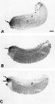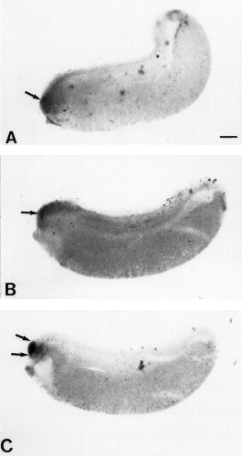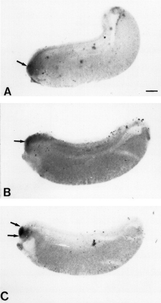 Figure 4. The effects of whole embryo immersion in retinoic aid upon Xbf1 expression. A: At stage 12, embryos were placed in retinoic acid (RA) (10-6 M) for 2 hr and allowed to develop to stage 28. There is very little positive Xbf1 staining. This Xbf1 staining is rather diffuse, and optic vesicles did not evaginate. Much of the staining was probably nonspecific staining due to the open anteriorbrain cavity. B: At stage 13, embryos were placed in RA (10-6 M) for 2 hr and allowed to develop to stage 28. There was a small amount of Xbf1 expression (arrow) in the most anterior aspect of the embryo (presumptive telencephalon). These embryos had optic vesicles, but the anterior neuropore did not fully close. C: Embryos incubated in RA (10-6 M) at stage 14 for 2 hr exhibited normal Xbf1-expression patterns after it was allowed to develop to stage 28. These embryos also had normal optic vesicles. Scale bar = 250 mu m in A (applies to A-C).