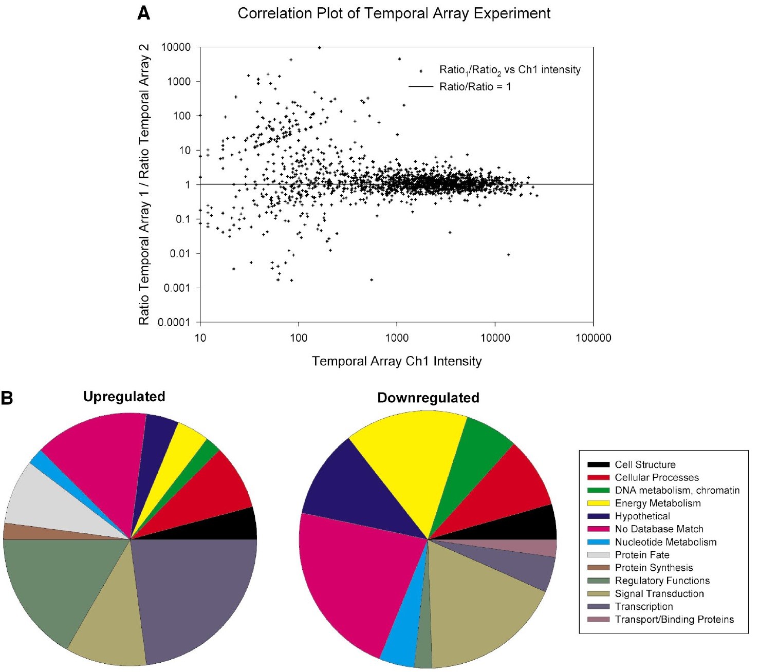 closer to 1. (B) Array targets showing increased and decreased RNA levels grouped into different categories. The 48 up-regulated and 45