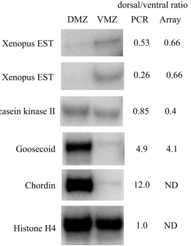 FIG. 2. PCR analysis of dorsal vs. ventral-induced genes. Genes