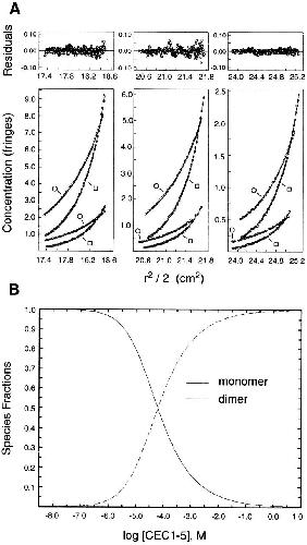 Figure 1. Sedimentation equilibrium analysis of the soluble C-cadherin ectodomain (CEC1-5). (A) Sedimentation equilibrium data. (Bottom) Show global fit of data collected at six loading concentrations ranging from 2–25 μM and rotor speeds of 10,000 rpm (○) and 14,000 rpm (□) to a monomer–dimer self association model. Symbols represent measured data points, and solid lines represent theoretical fits to the model. (Top) Illustrates the deviations of the measured points from the theoretical fit lines. (B) Plots illustrating expected fractions of monomer (solid line) and dimer (dashed line) at different CEC1-5 concentrations, calculated using the Kd(1-2) of 64 μM determined by the global fit of the sedimentation equilibrium data to a monomer–dimer association model.