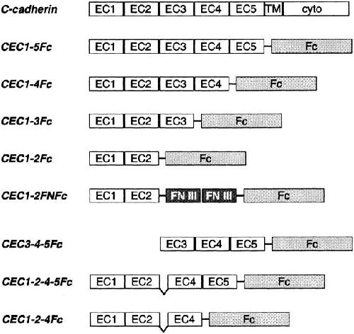 Figure 2. Schematic representation of Xenopus C-cadherin and the chimeric Fc fusion proteins. Full-length C-cadherin molecule consists of the ectodomain (five EC domains), transmembrane region (TM) and the cytoplasmic tail (CP). CEC1-5Fc consists of the ectodomain fused to the Fc part of the human IgG (Fc). Domains were expressed as Fc chimaeras to force dimerization, since dimerization of C-cadherin was shown to be crucial for adhesive function. CEC1-4Fc, CEC1-3Fc, and CEC1-2Fc consist of successively fewer number of cadherin repeats fused to Fc at the COOH terminus. CEC3-4-5Fc consists of the ectodomain deleted from the NH2-terminal region fused to Fc at the COOH terminus. CEC1-2FNFc consists of the first two domains fused to the two fibronectin type III repeats of the chicken N-CAM (FN III), still having Fc as the COOH-terminal region. CEC1-2-4Fc consists of successively domains 1-2 and 4 fused to Fc at the COOH terminus and on the same scheme CEC1-2-4-5Fc of domains 1-2 and 4-5.