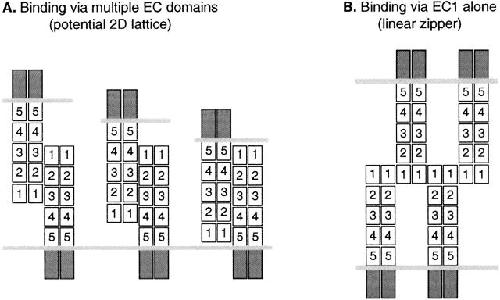 Figure 9. Model of adhesive bond formation via the extracellular cadherin repeats. (A) Binding via multiple EC domains, as demonstrated in this study. If binding sites have different orientations, cadherin dimers could form two-dimensional lattices (not shown). (B) Linear zipper model for the homophilic bond via the EC1 domains alone, as proposed in Shapiro et al. (1995).