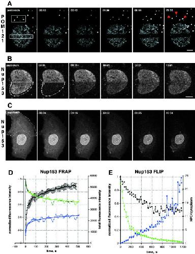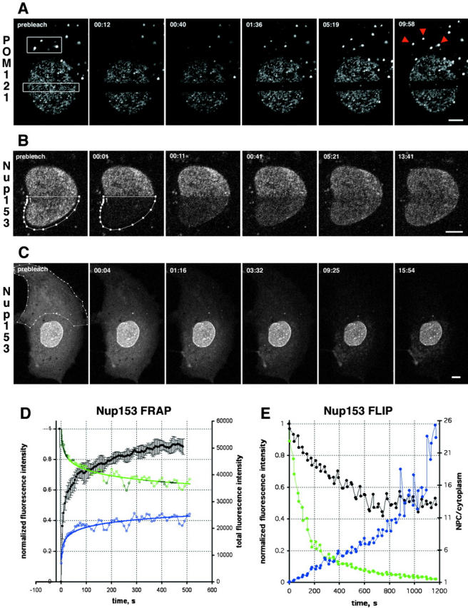 Figure 3. Turnover of nucleoporins within NPCs and ALPCs measured by FRAP. (A) FRAP of NRK cells expressing POM121-EGFP3 transiently. Boxed regions were photobleached and fluorescence recovery of ALPCs and NPCs was followed immediately after the bleach and then every 28 s in confocal sections. Arrowheads indicate the bleached AL. Note difference in recovery of AL and NPCs. Time, mm:ss. For quantitation see online supplemental Fig. S1 A. (B) FRAP of NRK cells expressing EGFP2-Nup153 transiently. Recovery was monitored immediately after the bleach and then every 5 s. Time and scale as in A. (C) FLIP of PtK2 cells expressing EGFP2-Nup153 transiently. Outlined region was photobleached repetitively 30 times every 30 s. Before and after each bleach the depletion of fluorescence was monitored in a confocal section. Time and scale as in A. (D) Plots of recovery in the bleached half and equilibration between bleached and nonbleached half of a Nup153 FRAP similar to B. Average mean intensities of the bleached region (black, left Y-axis) and standard deviation (n = 4). Data was normalized for total loss of fluorescence. Change of total fluorescence from the nonbleached (green) and bleached half (blue, both right Y-axis) measured for the experiment shown in B. (E) Plots of EGFP2-Nup153 depletion from the nucleus and cytoplasm for the FLIP in C. Average nuclear (black), cytoplasmic (green, both left Y-axis), and ratio of NPC/cytoplasmic fluorescence (blue, right Y-axis) is shown. Data was normalized to total loss of fluorescence. Note that nuclear fluorescence remains constant after initial loss of overlapping cytoplasmic signal, whereas cytoplasmic fluorescence is reduced to background levels. Bars, 5 μm. Online supplemental material (Fig. S1) is available at http://www.jcb.org/cgi/content/full/200101089/DC1.