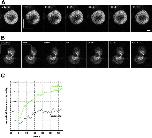 Figure 6. POM121 is immobilized during nuclear assembly in anaphase. FRAP of a NRK cell transiently expressing POM121-EGFP3. (A) Boxed area was photobleached to background levels in metaphase. Recovery was monitored every 9 s in a single image acquired with open pinhole. Note rapid recovery of fluorescence into the ER as the cell reaches metaphase/anaphase transition (02:15). (B) FRAP of the same cell as in A ∼6 min after anaphase onset. Note the absence of complete recovery during the transition to telophase. Times, hh:mm:ss. (C) Plot of recovery in the bleached areas shown in A and B for metaphase (green)and anaphase (black). Data was normalized to total loss of fluorescence, time 0 corresponds to the midpoint of the bleach. Note the difference in IFs 4 min after the bleach. Bars, 5 μm.