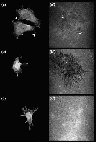 Figure 6. Xenopus XTC cells transfected with wild-type ADAM 13 remodel a fibronectin substrate. Xenopus XTC cells were plated on fluorescent fibronectin for 14 hr prior to fixation. Cells were permeabilized and processed for immunofluorescence with a mouse polyclonal antibody directed against (a) endogenous Xenopus ADAM 13 or (b) mAb 9E10 directed against the Myc-tag epitope. Fluorescence was observed with a confocal microscope. (a′′) Fluorescent fibronectin substrates correspond to the same fields as (a) immunostained cells. (a) Endogenous ADAM 13 is preferentially localized to the perinuclear endoplasmic reticulum and to cellular extensions at the cell periphery in nontransfected XTC cells (arrowheads). (a′) These cellular extensions colocalize with minor alterations in the fluorescent fibronectin substrate (arrowheads). (b) Cells transfected with wild-type ADAM 13 dramatically modified (b′) the substrate. In contrast, (c′) the fluorescent fibronectin substrate in contact with (c) E/A-transfected cells is comparable to the substrate of (a′) nontransfected control cells