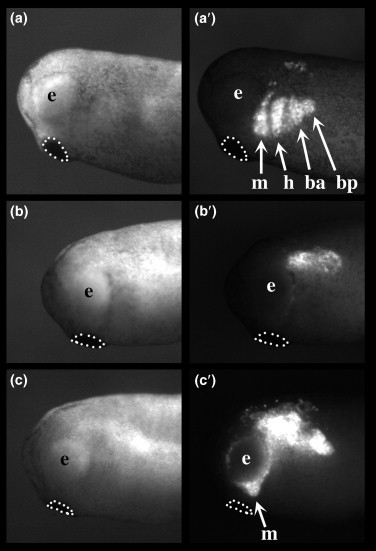 Figure 4. CNC grafts. Transcripts encoding GFP (0.3 ng) alone or in combination with wild-type (0.7 ng) or E/A (0.7 ng) ADAM 13 were injected in one blastomere of two-cell-stage embryos. Labeled cranial neural-crest explants were taken from stage 17/18 Xenopus embryos and grafted into unlabeled sibling embryos at the same position (CNC was removed from the host at this position). Lateral views of tailbud stage (stage 24) grafted embryos, with (a) bright field images on the left and (aâ²â²) fluorescent images on the right. (a,aâ²) Embryos that were grafted with cranial-neural crest that expressed both GFP and wild-type ADAM 13 were indistinguishable from (not shown) embryos grafted with CNC expressing GFP alone. (aâ²) Fluorescent neural-crest cells migrate along pathways normally used by CNC streams (m, mandibular; h, hyoid; ba, branchial anterior; bp, branchial posterior). (b) In contrast, cranial neural-crest cells expressing both the E/A ADAM 13 mutant and GFP (bâ²) do not migrate or (câ²) only migrate in the mandibular segment. The cement gland (dotted line) and (e) the future eye are used in each embryo as reference points for the evaluation of neural crest-cell position and the extent of migration