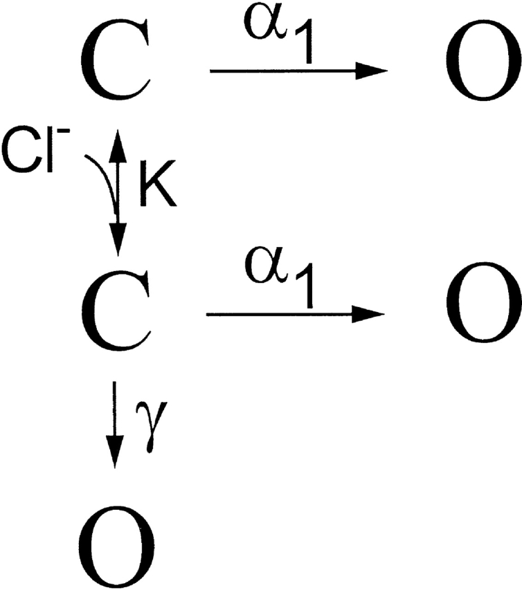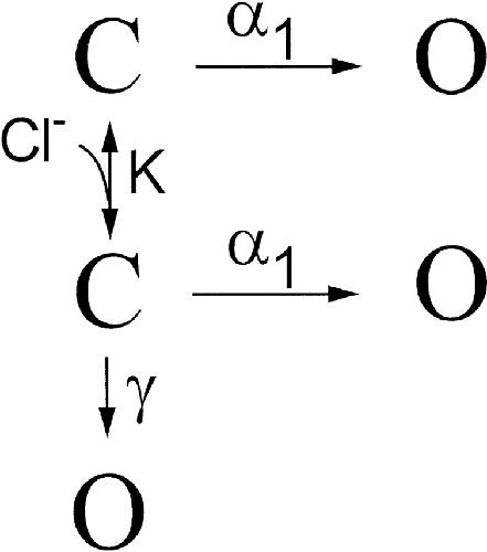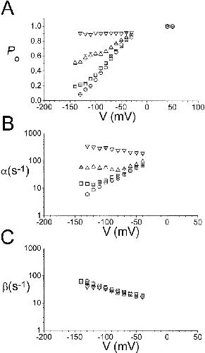 Figure 6. Fast gating properties of single C212S channels at different external pH. (A) Steady-state open probability. (B) Opening rate of the fast gate. (C) Closing rate of the fast gate. All rate constants were calculated according to and . External pHs were as follows: ▿, 5.6; Δ, 6.6; □, 7.6; and ○, 9.6. |