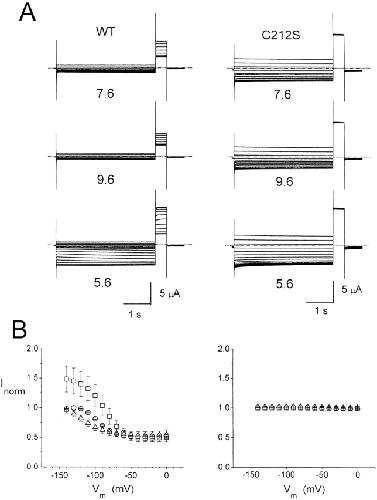 Figure 1. Quasi steady-state inactivation curves of the WT ClC-0 and the C212S mutant at different pH values. (A) Whole oocyte currents of the WT and C212S at three external pH. See materials and methods for the voltage protocol to examine the slow-gate inactivation. Dotted lines represent zero-current level. (B) Quasi steady-state inactivation curve of the WT (left, n = 3) and the C212S mutant (right, n = 4) at pH 7.6 (circles), 9.6 (triangles), and 5.6 (squares). |