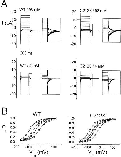 Figure 2. Effect of the external Cl− concentration on the fast gating of the WT channel and the C212S mutant. (A) Whole-cell current of the WT- and C212S-injected oocytes at 98 and 4 mM [Cl−]o. Voltage protocol is as described in materials and methods with a maximal depolarized voltage of +120 mV. (Insets) Expanded current traces corresponding to those within the squares to demonstrate the initial current of the fast gating relaxation at −100 mV. (B) Steady-state Po-V curve of WT and C212S at various [Cl−]o. Symbols are as follows: ○, 98 mM; Δ, 30 mM; ▿, 15 mM; and □, 4 mM. Solid curves were drawn according to a Boltzmann equation: Po = Pmin + (1 − Pmin)/[1 + exp(−zF(V − V1/2)/RT)], with z = 0.8–1.2, Pmin = 0.03–0.05. V1/2's were as follows: for WT, −91 (98 mM), −60 (30 mM), −42 (15 mM), and −14 mV (4 mM); for C212S, −79 (98 mM), −56 (30 mM), −39 (15 mM), and −12 mV (4 mM). |