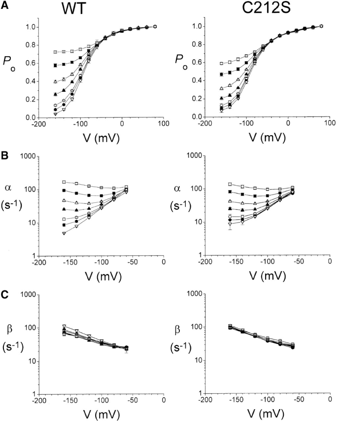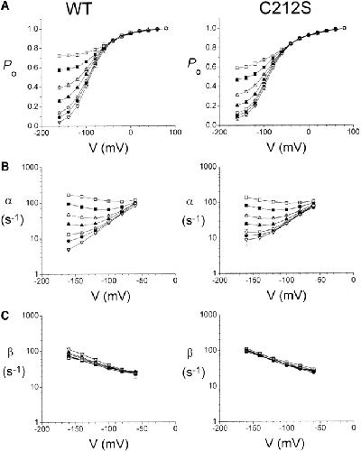 Figure 4. Fast-gating properties of the WT and C212S at different external pH values. All parameters were derived from macroscopic current recordings such as those shown in Fig. 3. (A) Effect of pH on the steady-state Po-V curve. All data were normalized to the initial tail current after a test pulse of +80 mV. (B) Effect of pH on the opening rate of the channels. (C) Effect of pH on the closing rate of the channel. Opening and closing rates were calculated according to and . Symbols and the pH were as follows: □, 5.1; ▪, 5.6; Δ, 6.1; ▴, 6.6; ○, 7.1; •, 7.6; and ▿, 9.6. Data points were connected by short straight lines. |