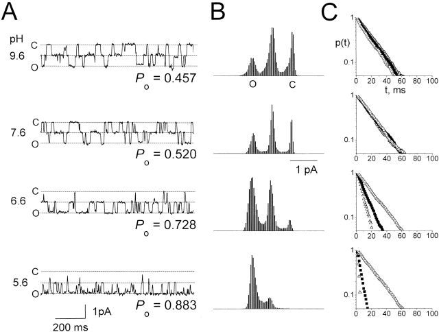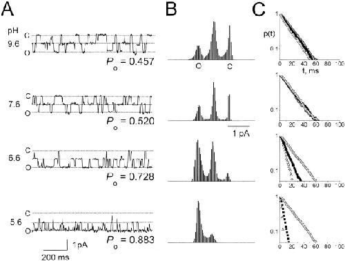 Figure 5. Single-channel recordings of C212S at different external pH. (A) Single-channel recording traces at the indicated external pH. Dotted lines are the assigned three current levels. C, closed state of the channel; O, fully open state of the channel. (B) All points amplitude histograms compiled from 30 s (pH 9.6), 30 s (7.6), 40 s (6.6), and 40 s (5.6) recording traces containing the example segments shown in A. The measured state probabilities (f0, f1, and f2) are as follows: (pH 9.6) 0.298, 0.491, and 0.211; (pH 7.6) 0.232, 0.496, and 0.272; (pH 6.6) 0.071, 0.402, and 0.527; (pH 5.6) 0.010, 0.214, and 0.776, resulting in the calculated Po values shown in A. Assuming a binomial distribution, the predicted state probabilities (f0, f1, and f2) calculated from Po are as follows: for pH 9.6, 0.295, 0.496, and 0.209; for pH 7.6, 0.230, 0.499, and 0.270; for pH 6.6, 0.074, 0.396, and 0.530; and for pH 5.6, 0.014, 0.206, and 0.780. (C) Dwell-time distributions of the events at the three current levels. Same traces as in B. Δ, ▪, and ○ represent the closed (level 0), intermediate (level 1), and fully open (level 2) current levels, respectively. The fitted time constants (τ0, τ1, and τ2) are as follows (in ms): for pH 9.6, 19.5, 18.8, and 17.6; for pH 7.6, 17.5, 19.9, and 18.7; for pH 6.6, 6.6, 10.9, and 19.8; and for pH 5.6, 1.8, 4.3, and 20.3. As discussed in materials and methods, because there are only 140 closed events at pH 5.6 in this analysis and their durations are heavily affected by the cutoff frequency, the estimate of τ0 at this acidic condition may have a relatively large error. |