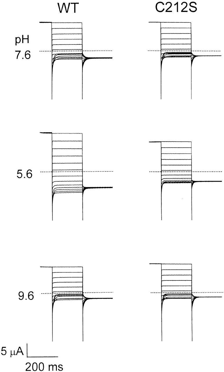 Figure 3. External pH effect on the macroscopic current of the WT and the C212S mutant. The recording traces at different pH were from the same oocyte. Voltage protocols are the same as in Fig. 2 A except that a maximal depolarizing test voltage of +80 mV was used. Dotted lines are the zero current level. |