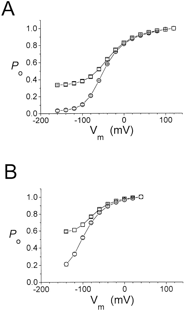 Figure 7. External H+ modulation of the fast gate Po-V curve of C212S at saturating and nonsaturating [Cl−]o. Data were derived from macroscopic current recordings at pH 7.6 (○) and 5.6 (□). (A) Comparison of the Po-V curves under different pH at 15 mM [Cl−]o (n = 3). (B) Comparison as performed in A at 300 mM [Cl−]o (n = 3–4). Data points were connected with short straight lines. |