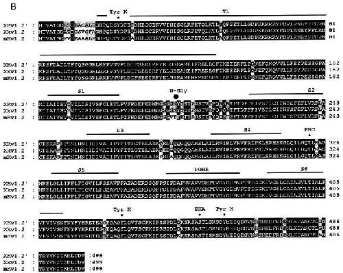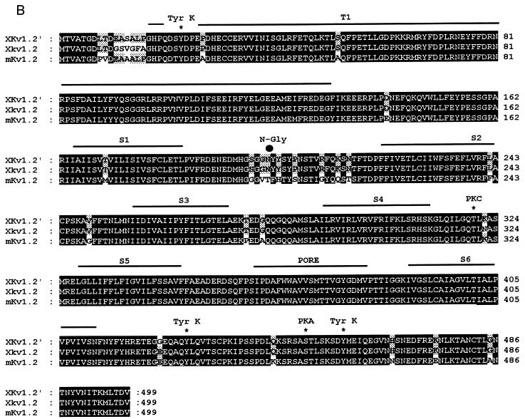 Fig. 1. (A) Nucleotide sequence of the XKv1.2′ cDNA (accession #AF373249) isolated from embryonic muscle, and the deduced amino acid sequence. The position of the nucleotide is indicated on the left, and amino acid on the right. (B) Alignment of the deduced amino acid sequence from XKv1.2′ with XKv1.2 and mouse Kv1.2 (mKv1.2). Identical residues are shaded in black, similar ones are shaded grey. The position of the tetramerization domain (T1), membrane spanning domains (S1–S6) and pore domains are indicated. The six amino acids (11–16) near the N-terminus differing from XKv1.2 [46] are indicated. Putative N-linked glycosylation site in the S1–S2 linker and phosphorylation sites by protein kinase C (PKC), protein kinase A (PKA) and tyrosine kinase (Tyr-K) are also indicated.
