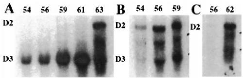 total RNA. This blot was hybridized only with the D2 probe. The numbers on