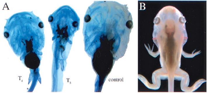 3 nM T4 (Left). They were stained for cartilage with Alcian blue. (B) Tadpole