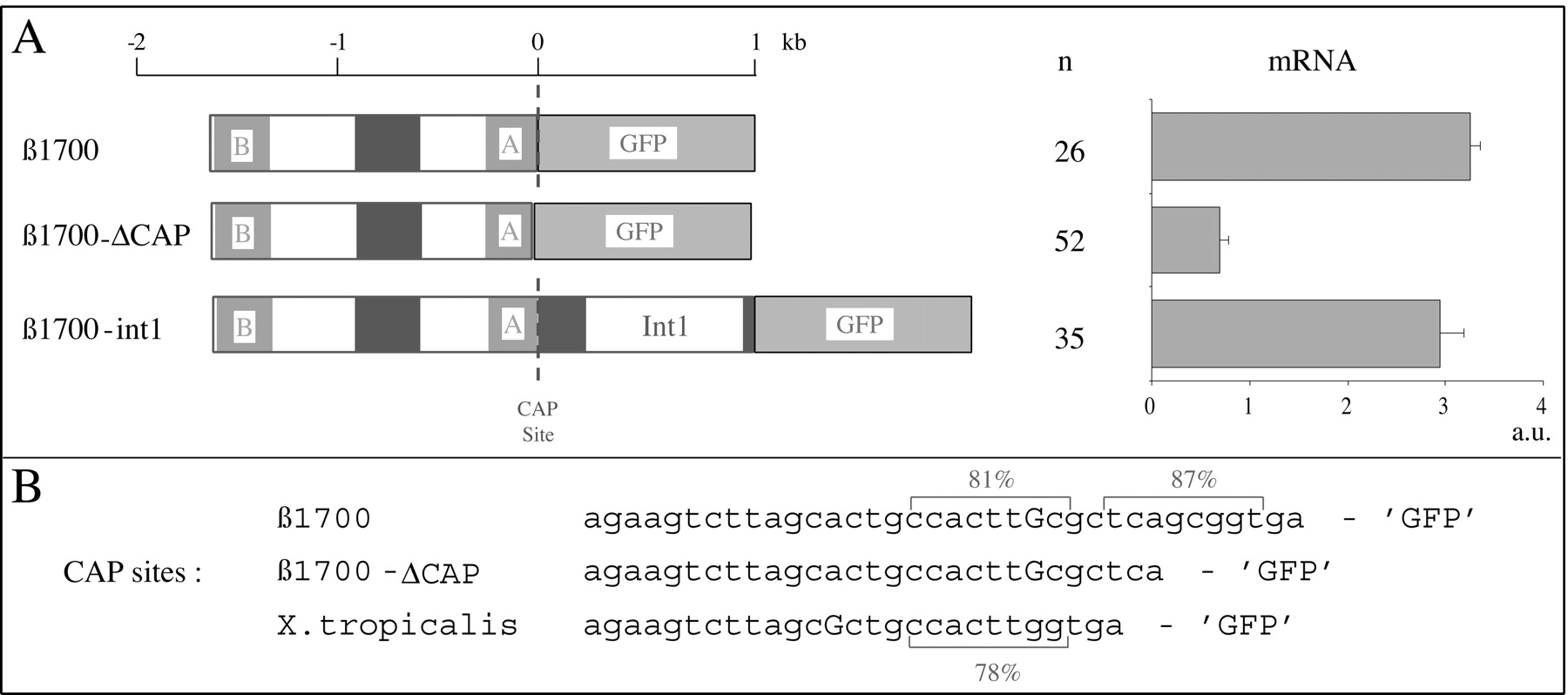 of embryos analyzed. B, shown is the comparison of the sequences surrounding the transcription initiation site in the 1700- CAP construct and