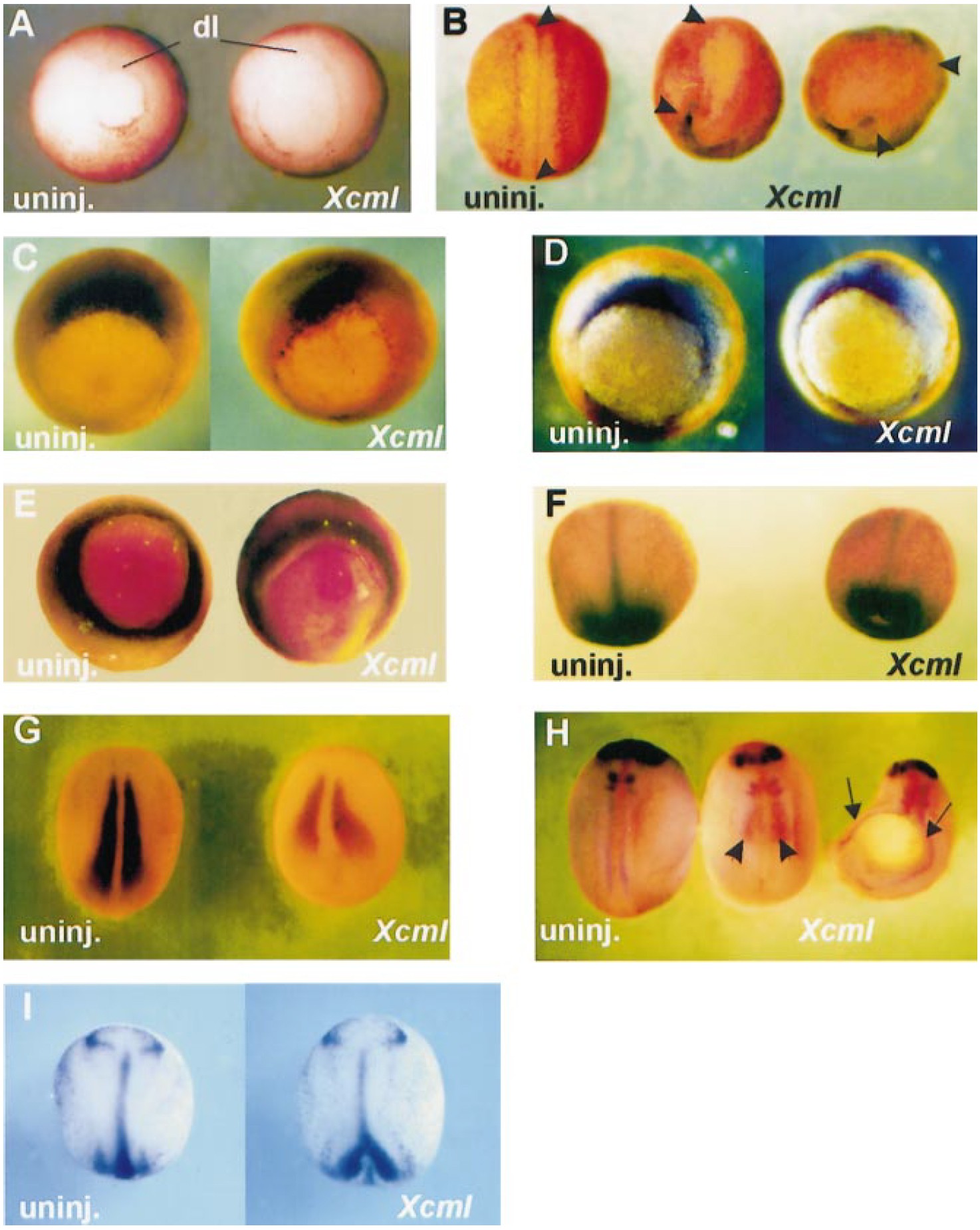 FIG. 4. Xcml overexpression blocks gastrulation movements. (A, B) Injection of Xcml mRNA in two dorso-vegetal blastomeres retards