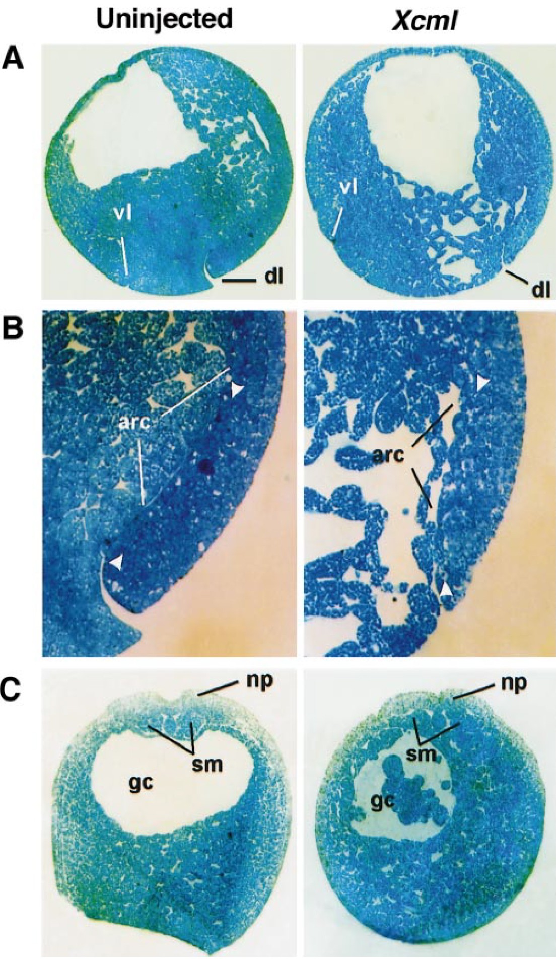 with head structures (eyes, cement glands). (B) Coinjection of Xcml