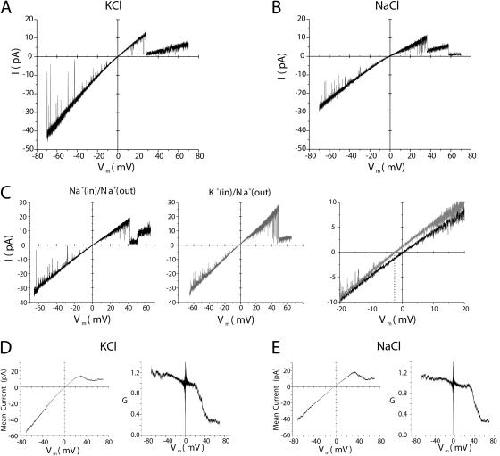 Figure 3. Unitary conductance and gating properties of Cx50 hemichannels do not differ in NaCl or KCl solutions in the absence of Ca2+. (A and B) Single Cx50 hemichannel currents obtained with 8-s voltage ramps from −70 to 70 mV applied to excised patches in symmetric KCl (A) or NaCl (B) solutions each containing 1 mM Ca2+/5 mM EGTA to maintain the free Ca2+ concentration <10−7 M. (C) Single Cx50 hemichannel currents obtained with 8-s voltage ramps from −65 to 65 mV applied to excised inside-out patches in symmetric NaCl solutions (left) or asymmetric KCl(in)/NaCl(out) solutions (center). Recordings are from the same patch. Segments of the I-V relationships are expanded to show the small shift in Erev −2.6 mV (right). (D and E) Conductance–voltage (G-V) relationships of Cx50 hemichannels (shown on right in D and E) constructed from ensemble (n = 20) averaged currents (shown on left in D and E) in response to ±70 mV, 8-s voltage ramps applied to cell attached patches. Pipette solutions containing KCl (D) or NaCl (E) were the same as in A and B.