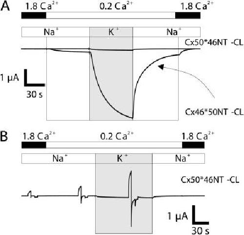 Figure 5. The difference in the sensitivity of Cx46 and Cx50 hemichannels to external K+ resides in the NH2-terminal half. (A) Shown are hemichannel currents upon replacing external Na+ with K+ in oocytes expressing Cx46*50NT-CL and Cx50*46NT-CL chimeric hemichannels. Oocytes were voltage clamped at −40 mV. Currents in oocytes expressing Cx46*50NT-CL, in which Cx46 sequence from the NT through the CL was replaced with Cx50, were strongly potentiated, much like Cx50, when Na+ was replaced with K+. The reciprocal chimera, Cx50*46NT-CL, was similar to Cx46 in being largely insensitive to external K+, except for a small shift in the baseline current that was also observed in uninjected oocytes. (B) Hemichannel currents in oocytes expressing Cx50*46NT-CL in response to hyperpolarizing and depolarizing pulses to −110 and +50 mV, respectively, applied from holding potential of −40 mV in Na+- and K+-containing external solutions. Membrane currents in Cx50*46NT-CL–expressing oocytes qualitative resemble those in Cx46-expressing oocytes and show an increase in external K+ similar to that of Cx46 hemichannels.