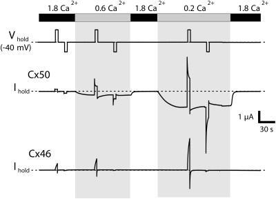 Figure 1. Membrane currents in Xenopus oocytes expressing Cx50 (middle) and Cx46 (bottom) respond differently to changes in external calcium. MND96 solutions with external Ca2+ concentrations of 1.8, 0.6, and 0.2 mM were applied to oocytes voltage clamped at −40 mV (Vhold). A pair of 5-s voltage steps, one depolarizing to +50 mV and one hyperpolarizing to −110 mV were applied at each Ca2+ concentration. Reducing external Ca2+ led to the development of a progressively larger inward current at Vhold in Cx50-expressing oocytes that was accompanied by progressively larger currents in response to both polarities of applied voltage steps. In contrast, little or no change in current at Vhold or in response to hyperpolarizing voltage steps were observed in Cx46-expressing oocytes upon reducing external Ca2+. However, currents elicited by the depolarizing steps were progressively larger as Ca2+ was reduced, consistent with the effects of Ca2+ previously described (Ebihara and Steiner, 1993).