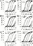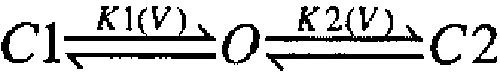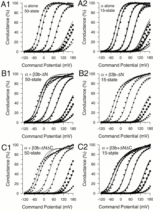Figure 9. Coupling of voltage-dependent charge movement of closed states to changes in Ca2+ binding affinity can account for the unusual shape of the α + β3b-ΔN G-V curves. In A1, points show G-V curves arising from α alone while the lines show the best fit with the 50-state model () in which voltage sensor movement does not affect Ca2+ affinity. Best fit values are given in Table . In A2, defined by the 15-state model (Fig. 1) was used to fit the α alone G-V curves. With all parameters not constrained, the value for Kx was indeterminate. Fixing Kx near the value for Kc yielded the fit shown by the solid line. In an alternative fit (dotted line), it was assumed that the charge moved during voltage-sensor movement (Q1) and that during the closed-to-open transition (Q2) were identical to that revealed by the fit to G-V curves arising from α + β3b-ΔN. In this case, the value for Kx converged to a value near that for Kc. Best fit values are given in Table . The fit corresponding to the line with open circles resulted when all parameters except Kc and Kx were constrained to values that resulted from fitting the α + β3b-ΔN curves in B2. In B1, G-V curves resulting from α + β3b-ΔN were fit with (50-state model). Two fits are shown: one in which the peak conductance was constrained to be 100%, and the other with all parameters unconstrained. In B2, G-V curves resulting from α + β3b-ΔN were fit with (15-state model), with all values unconstrained. In comparison to the best fit for α alone, values for Kx approach that for Ko. In C1, mean G-V values for α + β3b-ΔNΔC were fit with with all values unconstrained. In C2, G-V values for α + β3b-ΔNΔC were fit with , in one case with all values unconstrained (dotted line) and the other (solid line) with values for V(0) and L(0) constrained to those obtained in the fit to the α + β3b-ΔN data. |