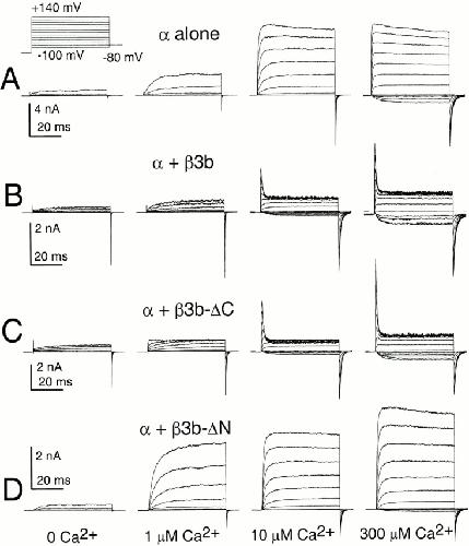 Figure 1. Activation of channels resulting from β3b constructs with or without the NH2- and COOH termini. In A, traces show currents obtained from an inside-out patch from a Xenopus oocyte injected with cRNA encoding the mouse Slo α subunit alone. Channels were activated by voltage steps from −100 to +180 mV after 20 ms at −140 mV; from left to right, panels show currents activated with 0, 1, 10, or 300 μM Ca2+. The voltage protocol is shown on the top. In B, traces show currents resulting from coexpression of α + β3b under conditions identical to those in A. In C, traces show currents resulting from α + β3b-ΔC coexpression, whereas, in D, currents reflect α + β3b-ΔN coexpression. |