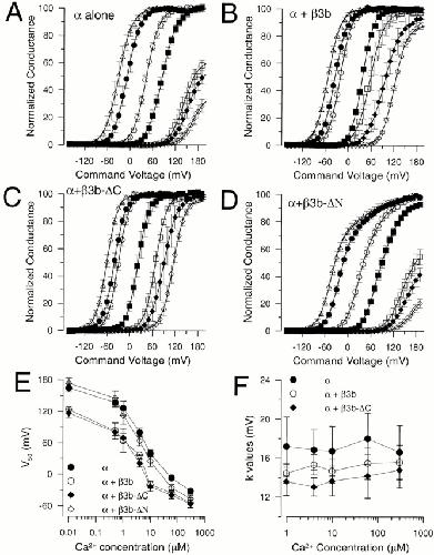 Figure 13. Comparison of deactivation time constants for different β3b constructs. In A, deactivation time constants (τd) obtained from single exponential fits to the tail current time course (Fig. 7) are plotted as a function of repolarization potential for currents from α subunit alone for 0 (⋄), 1 (♦), 4 (□), 10 (▪), 60 (○), and 300 (•) μM. In B, τd is plotted as a function of voltage for α + β3b currents with symbols as in A. In C, τd is plotted as a function of voltage for α + β3b-ΔC currents. In D, τd is plotted as a function of voltage for α + β3b-ΔN currents. In E, the deactivation rate measured at −80 mV is plotted as a function of Ca2+ for each construct (α, ⋄; α + β3b, ♦; α + β3b-ΔC, ○; and α + β3b-ΔN, •). In F, the deactivation rate measured at −160 mV is plotted as a function of Ca2+ with symbols as in E. Current deactivation for α alone is ∼1.5–2-fold faster than for currents resulting from any β3b construct. |