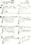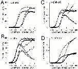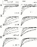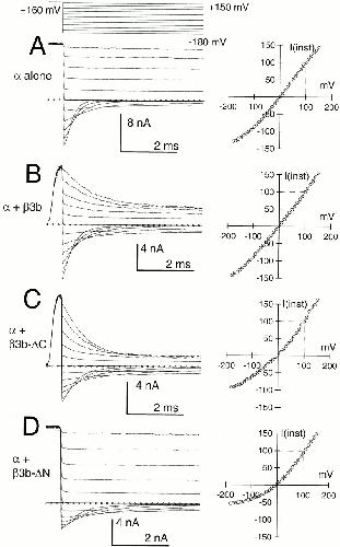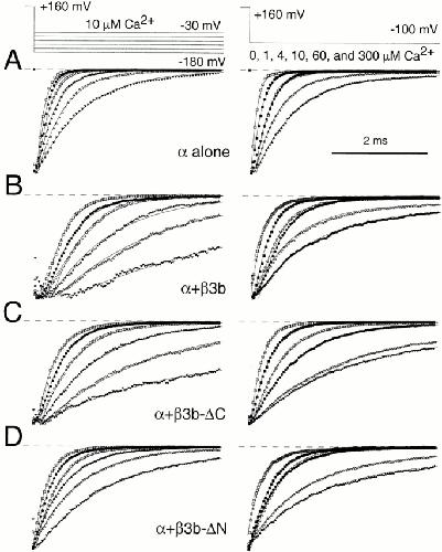 Figure 10. Normalized current activation time course as a function of voltage or Ca2+ for each β3b construct. In A, on the left, currents resulting from expression of α alone in an inside-out patch were activated at 10 μM with the indicated voltage-protocol. Each current was fit with a single exponential function, and the currents were then normalized to the maximal current activated at each command potential. On the right, currents were activated at +100 mV with 1, 4, 10, 60, and 300 μM Ca2+. Currents were again normalized to the maximal current amplitude activated at the command potential. In B, similar normalized currents are shown for α + β3b. In C, normalized currents are shown for α + β3b-ΔC. These appear essentially identical to those for α + β3b. In D, normalized currents are shown for α + β3b-ΔN. Even at the strongest activation conditions (+180, 10 μM Ca2+ on the left and +100 mV, 300 μM Ca2+ on the right), the α + β3b-ΔN currents activate more slowly than any of the other constructs. |