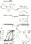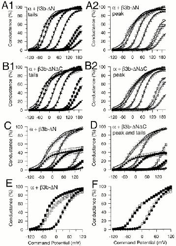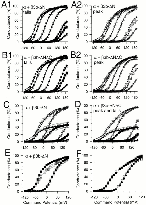 Figure 8. Comparison of families of peak and tail current G-V curves for both α + β3b-ΔN and α + β3b-ΔNΔC. In A, normalized G-V curves obtained from α + β3b-ΔN tail (A1; same as Fig. 3D) and peak (A2) currents are plotted for 0 (♦, ⋄), 0.5 (▪, □), 1 (•, ○), 4 (▴, ▵), 10 (▾, ▿), 60 (▸, ▹), and 300 (◂, ◃) μM Ca2+. Error bars are SEM for seven patches. Lines with small dotted circles represent fits of to each G-V curve, whereas a solid line shows the fit of , and 300 μM Ca2+. In B, G-V curves obtained from α + β3b-ΔNΔC tail (B1) and peak (B2) currents (4 patches) are plotted along with the fits of and . In C, normalized peak (open symbols) and tail current G-V curves for α + β3b-ΔN are compared for 0 (♦, ⋄), 1 (▪, □), 10 (•, ○), and 300 μM Ca2+ (▴, ▵). For each patch, the maximum tail current conductance was normalized to the maximum conductance estimated from the peak current. Error bars for the tail current estimates are larger here than in A because of additional variability in the relative amount of maximal tail to peak current conductance among patches. Fits of and to the peak current G-V curves are shown for 10 and 300 μM Ca2+ to emphasize that fails to describe the G-V curves at higher Ca2+. In D, relative amplitude of peak and tail current G-Vs are compared for α + β3b-ΔNΔC currents with symbols as in C. In E, the normalized peak (solid symbols) and tail current G-V curves for α + β3b-ΔN currents obtained at 10 and 300 μM Ca2+ are overlaid to emphasize the difference in shape between peak and tail G-V curves that is particularly pronounced at higher Ca2+. In F, a corrected tail current conductance (•, 10 μM Ca2+; ▪, 300 μM Ca2+) at each potential based on the measured tail current conductance and the nonlinearity of the instantaneous I-V curves (Fig. 7 E) was determined for α + β3b-ΔN currents. At each potential, tail current conductances (as in Fig. 7 E) were scaled by a factor defined by the idealized instantaneous I-V curve in Fig. 8, with the instantaneous conductance at −100 mV set to 1. Actual peak conductance values are also plotted (○, 10 μM; □, 300 μM). |