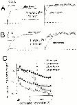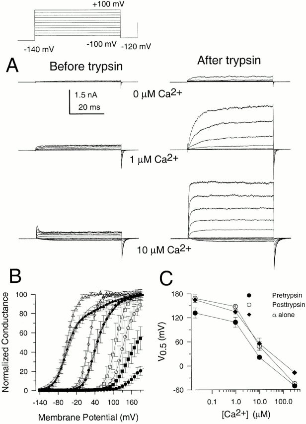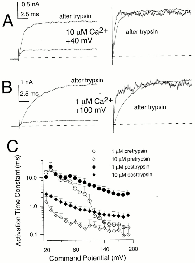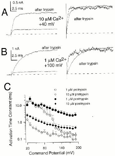 Figure 15. Removal of inactivation by trypsin slows the time to peak for activation of current, but has little effect on deactivation. In A, traces on the left show α + β3b currents for a patch activated with 10 μM Ca2+ by a step to +40 mV before and after trypsin application. At +40 mV with 10 μM Ca2+, there is no detectable time-dependent inactivation but just current rectification. On the right, the normalized currents are overlaid to show the faster apparent activation before trypsin-mediated removal of inactivation. In B, traces on the left show currents activated with 1 μM Ca2+ at +100 mV. The normalized currents on the right show a markedly faster time-to-peak of currents before trypsin application. In C, time constants of current activation were plotted as a function of command voltage for currents activated with either 1 or 10 μM Ca2+ either before (○, 1 μM; ⋄, 10 μM) or after (•, 1 μM; ♦, 10 μM) trypsin-mediated removal of inactivation. With inactivation intact, there is a faster apparent rate of current activation at low and moderate [Ca2+]. Points are mean and SD for three patches. |