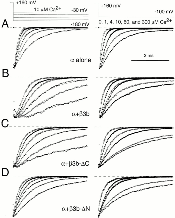 Figure 12. Tail current deactivation is similar for β3 currents with or without NH2- and COOH-terminals. In A, normalized tail currents are shown for the α subunit alone. On the left, traces show tail currents evoked with 300 μM Ca2+ at potentials from −180 to −30 mV (voltage protocol on the top). On the right, traces show tail currents evoked at −100 mV with 0, 1, 4, 10, 60, and 300 μM Ca2+. Points show every second or fourth digitized data value, while lines are single exponential fits to the current decay. For −180, −150, −120, −90, −60, and −30, the fitted τd was 0.16, 0.21, 0.26, 0.38, 0.56, and 1.01 ms, respectively. For 0, 1, 4, 10, 60, and 300 μM, τd was 0.12, 0.21, 0.30, 0.30, 0.52, and 0.85 ms, respectively. In B, traces show normalized tail currents for α + β3b currents. Note the delay before the exponential decay of the tail current observed at more positive deactivation potentials and higher Ca2+. For −180, −150, −120, −90, −60, and −30, τd was 0.41, 0.58, 0.70, 1.33, 2.16, and 4.8 ms, respectively. For 0, 1, 4, 10, 60, and 300 μM, τd was 0.25, 0.34, 0.53, 0.46, 0.88, and 1.24 ms, respectively. In C, normalized tail currents are shown for α + β3b-ΔC. Again note the delay in current decay before the onset of exponentiality. For −180, −150, −120, −90, −60, and −30, the fitted τd was 0.39, 0.48, 0.71, 1.2, 2.32, and 2.74 ms, respectively. For 0, 1, 4, 10, 60, and 300 μM, τd was 0.25, 0.39, 0.60, 0.93, 1.76, and 1.96 ms, respectively. In D, normalized tail currents are shown for α + β3b-ΔN. Note the absence of the delay before exponentiality. For −180, −150, −120, −90, −60, and −30, the fitted τd was 0.29, 0.37, 0.47, 0.67, 0.96, and 1.51 ms, respectively. For 0, 1, 4, 10, 60, and 300 μM, τd was 0.30, 0.47, 0.58, 0.60, 1.21, and 1.56 ms, respectively. |