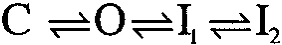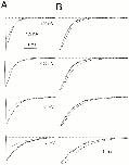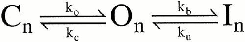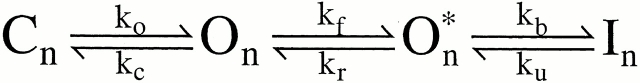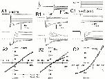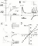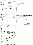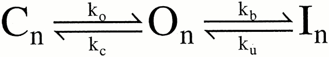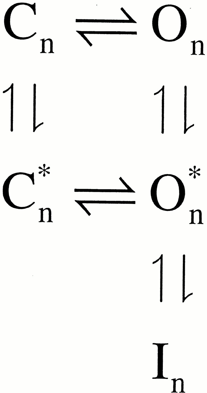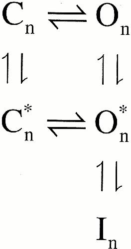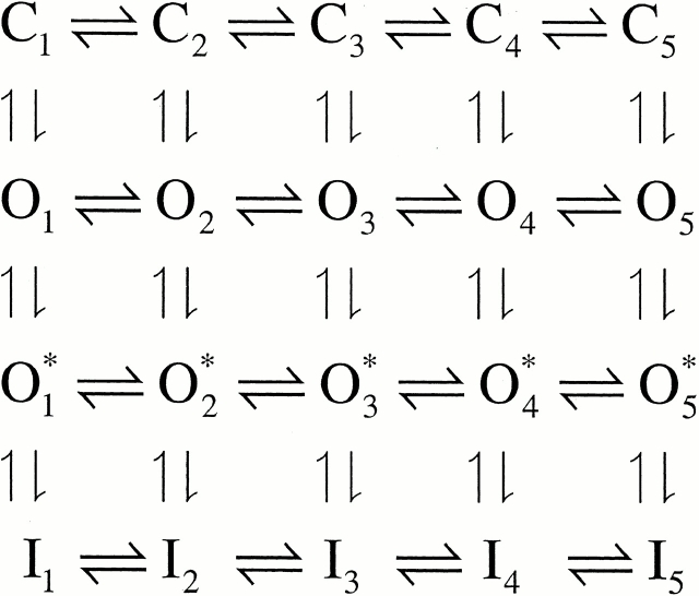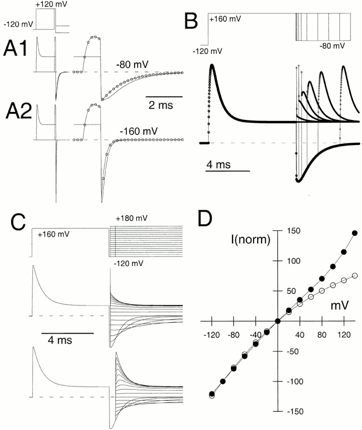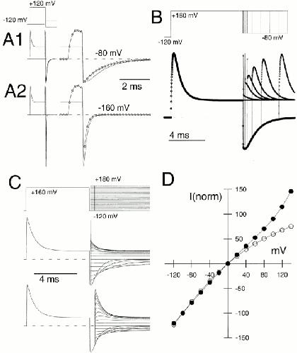 Figure 15. Fig. 2 predicts currents that exhibit properties similar to those observed for α + β3b currents. In A, Fig. 2 (with parameters in Table ), assuming 10 μM Ca2+, was used to simulate currents with the indicated protocol (as in Fig. 2). Tail currents were compared at either −80 mV (A1) or −160 mV (A2), after either a short (1 ms) or longer (10 ms) activation step. Single exponential fits to the decay phases yielded time constants of 1.23 and 1.24 ms, for the shorter and longer activation steps, respectively. In A2, tail current was elicited at −160 mV. Time constants of deactivation were 0.227 ms (longer step) and 0.221 ms. In B, a paired-pulse protocol (as in Fig. 10) was used to model the recovery from inactivation with Fig. 2 (values from Table ; 10 μM Ca2+). Points show each simulated value (10 μs). The tail current exhibits the rapid nonohmic unblocking, followed by a slower unblocking. After the shorter recovery steps (500 μs), a subsequent depolarization to +160 mV results in rapid reblock with only a small excess of current over the previous steady-state level of block. Longer recovery steps result in an increase in the initial amount of current observed during the step to +160 mV, even as the tail current at −80 mV decreases. For the transition rates between O* and I in Table , at short recovery times the step to +160 mV also results in a 10–20-μs rapid spike of current associated with the rapid reblocking of channels from O* to I. Currents were simulated at 10 μs per point, and the spike of current lasted 1–2 points. In C, the indicated protocol (as in Fig. 11) was used to simulate currents assuming 10 μM Ca2+. In the middle panel, a 100-μs recovery step to −120 mV preceded a subsequent step to potentials between −120 and +180 mV. In the bottom panel, a 500-μs step to −120 mV was used to produce recovery from inactivation. In D, the instantaneous I-V from the traces in C were determined by measuring current values 30 μs after the nominal end of the recovery steps. Values were normalized to current amplitudes at −100 mV. At 30 μs, the spike of reblocking observed in the simulated currents is complete. The I-V curve becomes more linear after the 500-μs recovery step (•), which is indicative of greater occupancy of On. Simulation frequency: 100 kHz. |
