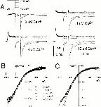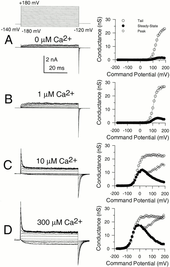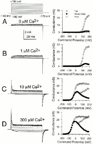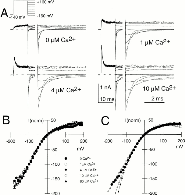 Figure 8. Properties of instantaneous current-voltage (I-V) curves following repolarization from a steady-state–inactivated condition. In A, currents were activated by the indicated voltage protocol at various Ca2+ (0, 1, 4, and 10 μM Ca2+). For all Ca2+, there is a large, immediate nonohmic increase in tail current indicative of rapid unblocking from inactivation. In B, the current was measured 100 μs after the nominal time of the repolarizing voltage step and normalized to the current measured with the step to −100 mV. The shape of the I-V curve is identical for all Ca2+. In C, the mean and standard deviation for the instantaneous I-V curve from five patches at 10 μM Ca2+ are plotted, along with the best fit of . For the fit with solid circles all values were unconstrained yielding Gmax = 30.5 ± 24.0; K2(0) = 51.7 ± 49.44 and Q2 = 0.154e ± 0.020e. For the fit with diamonds, Gmax was constrained to 2.0 with K2(0) = 2.27 ± 0.045 and Q2 = 0.209e ± 0.005e. For the open circles, Gmax was constrained to 1.0 with K2(0) = 0.504 ± 0.07 and Q2 = 0.341e ± 0.03e. |