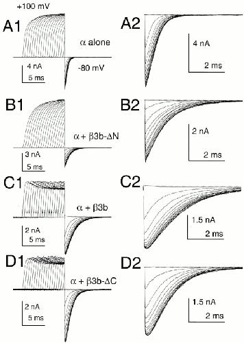 Figure 3. Slowing of deactivation as a function of activation step duration is not unique to α + β3b currents. In A1–D1, outward current was activated with 10 μM Ca2+ by a step to +100 mV from a holding potential of −120 mV. For each sweep, the step to +100 mV was varied from 0 to 9.5 ms in 0.5-ms increments, before a repolarizing step to −80 mV. Currents resulted from the following constructs: (A) α alone; (B) α + β3b-ΔN; (C) α + β3b; and (D) α + β3b-ΔC. For these constructs, a direct step to −80 mV from −120 mV results in minimal inward current activation. A2–D2 show the tail currents on an expanded time base. For α alone (A2) and for α + β3-ΔN (B2), tail currents become slower with command step duration, but the decay qualitatively appears to begin a single exponential time course immediately after the repolarizing step. For α + β3b (C) and α + β3b-ΔC (D), tail current decay also appears to slow with command step duration. However, in contrast to the noninactivating currents, as the command step is increased in duration there is an increase in a shoulder of tail current that precedes the onset of an exponentially decaying current. For all panels, a P/N leak subtraction procedure was used (see materials and methods). |