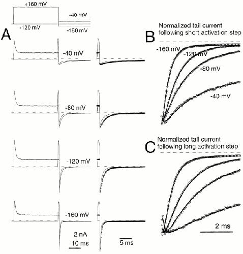Figure 5. Inactivation is associated with the appearance of a rapid unblocking component in the tail current. In A, a protocol similar to that used in Fig. 2 was used to examine tail currents at repolarization potentials of −40, −80, −120, and −160 mV with 10 μM Ca2+. In the right-hand traces of A, points show every twentieth digitized value for currents resulting from a 40-ms activation step. In B, normalized tail currents after the 2-ms activation step (from A) are shown for the indicated repolarization potentials. Only every fifth digitized value (50 μs) is displayed. At the most positive repolarization potential (−40 mV), there is a pronounced lag before the tail current begins to decay in an exponential fashion. At more negative potentials, after a brief capacitative current, the current begins an exponential decay fairly rapidly. Lines correspond to a fitted two exponential function, A1 · exp(−t/τu) + A2 · exp(−t/τd) + offset, where τu corresponds to an unblocking relaxation, and τd corresponds to the deactivation time course. At −160 mV, τu = 0.087 ms and τd = 0.44 ms; at −120 mV, τu = 0.113 ms and τd = 0.98 ms; at −80 mV, τu = 0.172 and τd = 1.50 ms; and at −40 mV, τu = 0.134 and τd = 2.16 ms. In C, normalized tail currents activated after a 40-ms activation step are shown over the same range of repolarization potentials. At both −40 and −80 mV, there is a distinct increase in tail current after the capacitative transient. At both −120 and −160 mV, the shoulder of current before the onset of exponential decay is more pronounced than in B. Open symbols again show every fifth digitized data value, whereas solid lines correspond to a two exponential fit to the decay time course. Fitted values were as follows: at −160 mV, τu = 0.128 ms and τd = 0.57 ms; at −120 mV, τu = 0.173 ms and τd = 1.42 ms; at −80 mV, τu = 0.232 ms and τd = 2.415 ms; and at −80 mV, τu = 0.183 and τd = 5.64 ms. |
