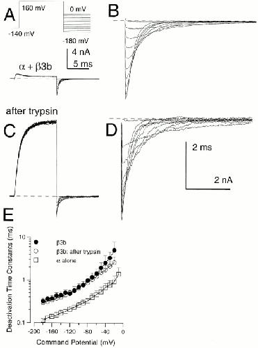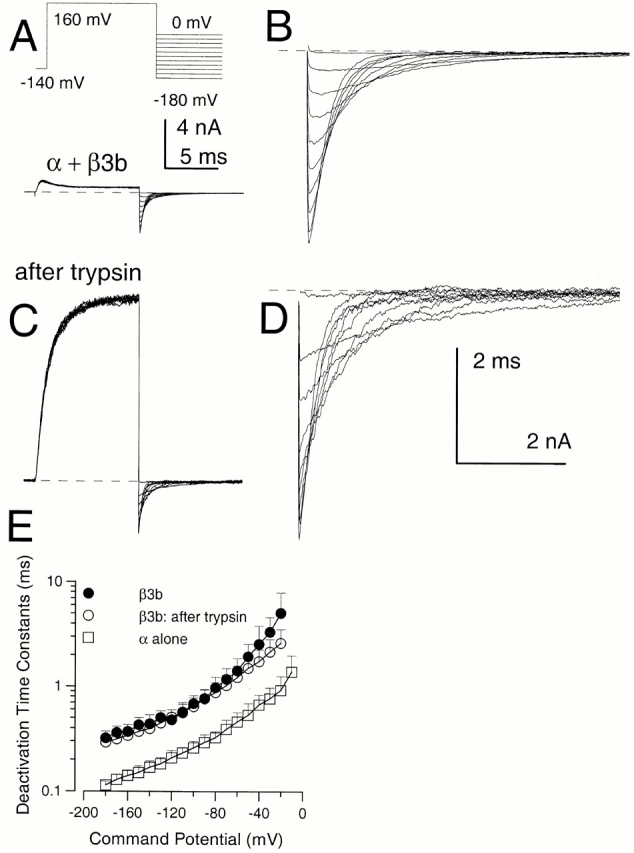 Figure 6. Effects of trypsin on α + β3b currents. In A, currents in an inside-out patch expressing α + β3b channels were activated by the indicated voltage protocol with 10 μM Ca2+. In B, the tail currents at potentials from 0 mV to −180 mV are displayed at higher magnification. In C, trypsin was briefly applied to the same patch shown in A resulting in removal of inactivation, whereas D shows the tail currents after trypsin at higher magnification. After trypsin, peak outward current at +160 mV appears to activate more slowly and is markedly larger. In contrast, tail current amplitudes exhibit a more modest increase after trypsin. The calibration bar in A also applies to C, while B and D share a calibration bar. Tail current amplitude at more positive repolarization potentials exhibits a larger increase following trypsin than those at more negative potentials. After trypsin application, the tail current decay follows a relatively simple exponential time course, whereas, before trypsin, there is a brief rising phase. In E, time constants of deactivation (τd) are plotted for α + β3b currents before (•) and after (○) trypsin and compared with τd for currents arising from α alone (□). Tail currents for intact α + β3b were fit with a two exponential function to approximate the fast unblocking shoulder of current and then the deactivation of current. Points show means and standard deviations for at least four patches. |