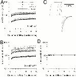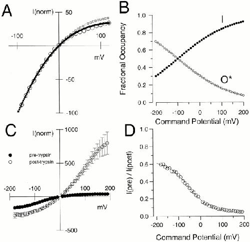 Figure 9. Despite fast unblocking, α + β3b tail currents exhibit a residual voltage-dependent blockade at negative potentials. In A, the instantaneous I-V curve obtained with 10 μM Ca2+ (○) is replotted (from Fig. 8 C) along with the fit for the case where Gmax was constrained to 2.0 (•). Predictions based on the values given in Table and used for the simulations in Fig. 15 are also shown (□; also see Online Supplemental Materials available at http://www.jgp.org/cgi/content/full/117/6/583/DC1). In B, based on the values for K2(V) obtained from the fit shown in A, fractional occupancy in O*n (○) and In (•) was calculated and plotted as a function of the potential at which the tail current was measured. In C, tail current amplitudes (normalized to −100 mV) were measured for three patches before (•) and after (○) removal of inactivation with trypsin. In D, the ratio (○) of tail current amplitude at 100 μs before trypsin application to that after removal of inactivation is plotted as a function of repolarization potential. Note the correspondence of these values to those for O*n in panel B. The solid line is a fit of the following equation:fV=fmax1+K0exp−zFVRT,where fmax = 0.613, K(0) = 3.32 and z = −0.503. |