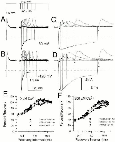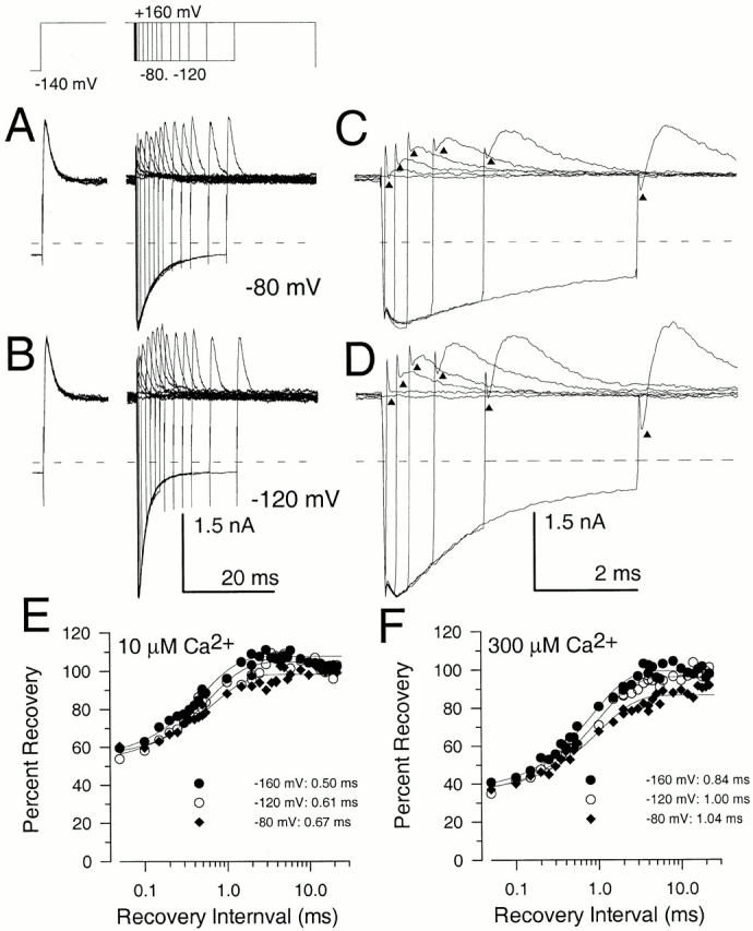 Figure 10. Paired pulse recovery protocols reveal a slow recovery from inactivation despite nearly complete recovery from block in the peak tail current. Recovery from inactivation was assessed using the indicated voltage-protocol. The duration of the initial inactivating step to +160 mV was 40 ms. Recovery steps were varied from 50 μs to 40 ms, although not all are displayed. In A and B, currents were activated with 10 μM Ca2+, and the recovery potential was either −80 mV (A) or −120 mV (B). In C and D, selected traces from A and B are shown on a faster time base. For faster time records, traces correspond to recovery intervals of 0, 0.05, 0.25, 0.5, 1.0, 2.0, and 5.0 ms. Triangles draw attention to the amount of outward current present immediately after completion of the capacitative transient associated with the second test step to +160 mV. For brief recovery intervals, this instantaneous level of current is identical to the steady-state level of current at +160 mV. With longer recovery intervals, the amplitude of the instantaneous current indicated by the triangles increases even as the tail current at −80 or −120 mV is beginning to decrease. The dotted line indicates the zero current level. In C, the percent recovery measured from the paired pulse protocol is plotted as a function of the recovery duration at each of three recovery potentials with 10 μM Ca2+. The solid lines represent single exponential fits to the recovery time course. At −80 mV, a two exponential fit gave a somewhat better description of the recovery time course, but, at more negative potentials, a two exponential time course did not substantially improve the quality of the fit. At −160 mV, τr = 0.5 ms; at −120 mV, τr = 0.61 ms; and at −80 mV, τr = 0.67 ms. In D, the time course of recovery in the paired pulse protocol is shown for 300 μM from the traces in Fig. 11 B. At −160 mV, τr = 0.84 ms; at −120 mV, τr = 1.00 ms; and at −80 mV, τr = 1.04 ms. |