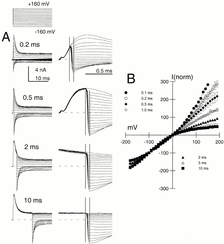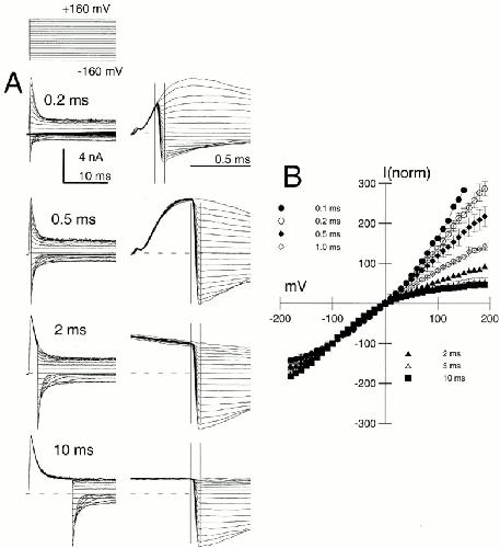 Figure 12. Instantaneous I-V curves for α + β3b currents change as a function of duration of the activation step. In A, α + β3b currents were activated with 10 μM Ca2+ with the voltage protocol shown on the top, except the command step duration was varied as indicated on the figure. Traces on the right are faster time base records of the traces on the left focusing on the properties of currents after repolarization. The vertical bars show the time points at 0 and 80 μs relative to the nominal time of the voltage-step. For the 200-μs activation step, note that currents after repolarization to voltages negative to zero are more closely spaced than those positive to zero, indicative of the intrinsic outward rectification. Sampling period, 10 μs; filter, 10 kHz. In B, current amplitudes were measured at the 80-μs time point after repolarization for each voltage, normalized to the trace at −100 mV, and plotted as a function of repolarization potential. |