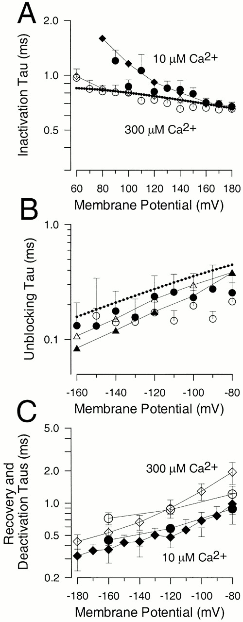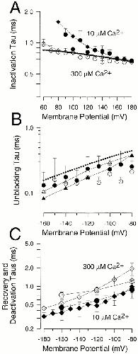 Figure 13. Kinetic characterization of α + β3b currents. In A, inactivation time constants (τi) were measured over a range of voltages for currents activated with either 10 (•) or 300 μM (○) Ca2+. Each point represents values for 11–14 patches with error bars showing the standard deviation. Diamonds indicate τi measured from the simulated currents (see Supplemental Materials, Figure S3 available at http://www.jgp.org/cgi/content/full/117/6/583/DC1) for 10 μM (♦) and 300 μM (⋄) Ca2+. The dotted line was calculated from with values from Table . In B, the fast unblocking component observed in tail currents was measured from fits of A1 · exp(−t/τ1) + A2 · exp(−t/τ2) + B to the α + β3b tail currents as in Fig. 5 and Fig. 7. The fast unblocking time constants plotted here were from measurements made at either 10 μM (•) and 300 (○) μM Ca2+ (error bars are the standard deviation). The dotted line corresponds to the expectations for the fast unblocking time constant from values in Table assuming that describes τu. Triangles are fitted τu values from simulated currents (see Fig. 15) for 10 μM (▵) and 300 μM (▴) Ca2+. In C, time constants for recovery in outward current amplitude measured from the paired pulse protocol of Fig. 10 are plotted as a function of recovery potential for 10 μM (•, five patches) and 300 μM (○: three patches) Ca2+. For comparison, values for current deactivation of α + β3b currents at 10; ♦, seven patches) and 300 μM Ca2+ (⋄, six patches) are also shown. Error bars indicate SD. The similarity of deactivation time constants and the recovery in amplitude from the paired pulse protocol suggests that similar rate-limiting transitions are involved for each. |