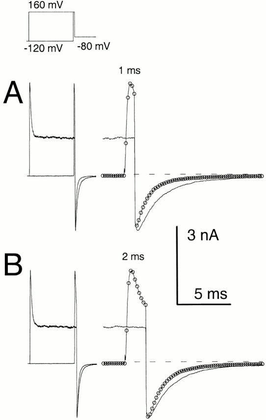 Figure 2. α + β3b currents rapidly recover from inactivation. Currents through α + β3b channels were activated in the presence of 10 μM Ca2+ by the voltage protocol shown on the top. Scale bars apply to the expanded time base traces displayed on the right. In A, traces compare tail currents after repolarization to −80 mV at the end of either a 1- or 40-ms step to +160 mV. The left traces show the complete current record, whereas the right-hand traces show the tail currents on an expanded time base. Despite the fact that outward current at the end of the 1-ms step to +160 is more than twice that at the end of the 40-ms step to +160 mV, maximal tail current amplitude after repolarization is actually larger in the latter case. Furthermore, the current decay time is markedly slower. For currents activated with the brief steps to +160 mV, symbols plot every twentieth digitized point. In B, tail currents at −80 mV are compared after either a 2-ms or a 40-ms step to +160 mV. The tail current amplitude is similar in both cases despite the fact that outward current at +160 mV differs markedly. |