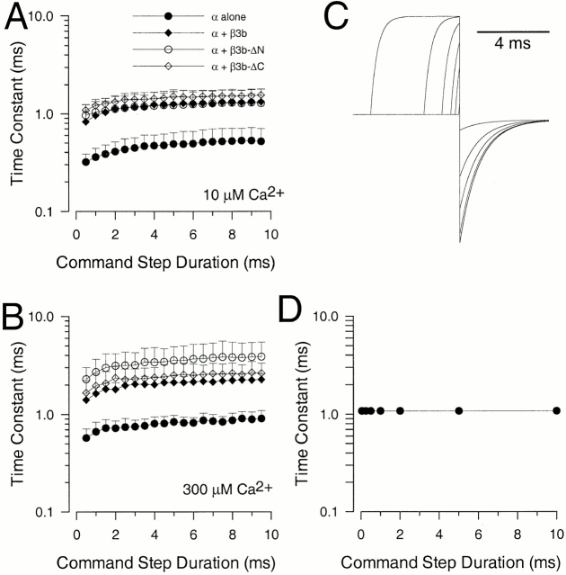 Figure 4. The dependence of tail current deactivation time constant on command step duration. The protocol shown in Fig. 3 was used to activate tail currents at different times after a step to +100 mV. In all cases, single exponential functions were fit to the decaying phase of the tail currents. In A, means and standard deviations of deactivation time constants measured with 10 μM Ca2+ are plotted as a function of activation step duration. Each construct exhibits a similar factional change in decay time as the command step is increased from 0.5 to 9.5 ms. In B, time constants and standard deviations were determined in 300 μM Ca2+. Prolongations are similar for each of the constructs. In both A and B, each point corresponds to a minimum of five patches. In C, a protocol similar to that used in Fig. 3 was simulated for a MWC 10-state activation model using rates similar to those given in Table derived from of Cox et al. 1997. In D, tail current time constants measured from C are plotted as a function of command step duration. |