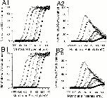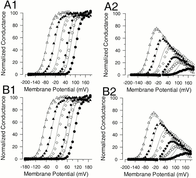 Figure 14. Families of G-V curves obtained from both steady-state and tail current measurements do not distinguish between Fig. 1 and Fig. 2. Tail current amplitudes and steady-state current amplitudes were measured in one patch at 0, 0.5, 1, 4, 10, and 300 μM Ca2+. The normalized conductance is plotted as a function of command potential with tail current measurements in the left column (A1 and B1) and steady-state current estimates (A2 and B2) on the right. In A, both panels were fit simultaneously with the expanded MWC version of Fig. 2 defined by and . KC = 10.11 ± 0.75; K0 = 0.66 ± 0.05; L(0) = 1775.74 ± 1280; Q = 1.26e ± 0.13; K1(0) = 0.31 ± 0.10; Q1 = 0.44e ± 0.14e; K2(0) = 2.17 ± 3.6; Q2 = 0.19e ± 0.21. In B, both panels were fit simultaneously with similar equations defined by Fig. 1, assuming essentially instantaneous recovery from I to O at the tail current potential. KC = 11.20 ± 0.17; K0 = 0.75 ± 0.04; L(0)=1096.3 ± 243; Q = 1.41e ± 0.045; K1(0) = 0.71 ± 0.14; Q1 = 0.342e ± 0.04. |