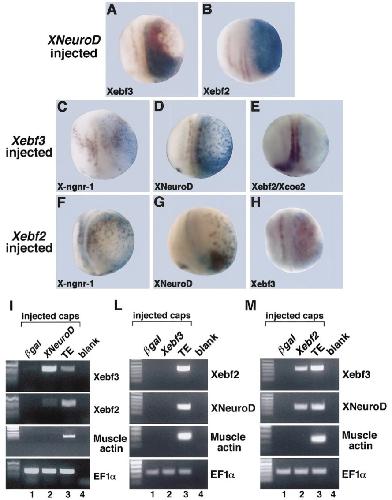 FIG. 5. Xebf2/Xcoe2, XNeuroD, and Xebf3 function in a unidirectional cascade during primary neurogenesis. Embryos were injected with RNA for XNeuroD (A, B), Xebf3 (C), and Xebf2 (F) at the two-cell stage and then assayed by whole-mount in situ hybridization at neural plate stages. Embryos are shown in a dorsal view with anterior to the bottom and injected side to the right (marked by X-gal staining). Overexpression of XNeuroD promoted ectopic expression of Xebf3 (A), while it suppressed the expression of Xebf2/Xcoe2 (B). Overexpression of Xebf3 did not affect Xngnr-1, XNeuroD, and Xebf2/Xcoe2 expression patterns (C), while Xebf2/Xcoe2-injected embryos showed ectopic expression of Xngnr-1, XNeuroD, and Xebf3 (F-H). (I) RT-PCR performed on animal caps isolated from XNeuroD (I), Xebf3 (L), or Xebf2/Xcoe2 (M) -injected embryos. The overexpression of XNeuroD caused a strong ectopic activation of Xebf3 (I, lane 2). Note that, in these caps, XNeuroD induced a very weak expression of Xebf2/Xcoe2 (I, lane 2). Overexpression of Xebf3 did not induce the expression of Xebf2 or XNeuroD (L, lane 2). In contrast, Xebf2-injected caps showed the activation of XNeuroD as well as Xebf3 (M, lane 2). Caps isolated from ï°gal-injected embryos and RNA extracted from total embryos (TE) served as negative and positive controls (lanes 1 and 3). Muscle actin was used as a mesodermal marker, and EF1-alpha was used to normalize the samples.