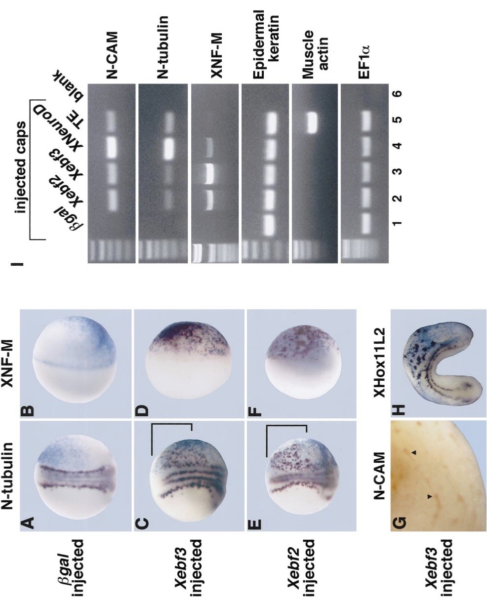 FIG. 4. Xebf3 and Xebf2/Xcoe2 overexpression promotes ectopic expression of neural markers in vivo and in animal caps. (A) RNA was injected into one cell of two-cell stage Xenopus embryos, and then embryos were collected at neural plate stages for in situ hybridization analysis, using the probes indicated at the top. Shown are dorsal views of representative embryos with anterior to the bottom and the injected side, revealed by X-gal staining, to the right. (A, B) Control embryos injected with RNA for Beta-galactosidase. N-tubulin is expressed in developing primary neurons, while XNF-M is normally expressed later, starting at stage 19. (C) Overexpression of Xebf3 (C, D) or Xebf2/Xcoe2 (E, F) promoted ectopic neurogenesis, as detected by whole-mount in situ hybridization using an N-tubulin probe or a XNF-M probe. Embryos injected with either Xebf3 or Xebf2/Xcoe2 showed a scattered pattern of N-tubulin-positive neurons restricted to the posteriorectoderm (C, E) compared with the more extensive and stronger distribution of ectopic XNF-M-positive neurons (D, F). (G) Stage 28 Xebf3-injected embryo immunostained with the anti-N-CAM antibody 6F11 (enlargement of the ventral side). Arrowheads indicate ectopic process-bearing neurons. (H) Xebf3-overexpressing cells show characteristics of sensory neurons. Dorsal view (anterior to the left) of a stage 26 Xebf3 overexpressing embryo with the injected side indicated by X-gal staining. Overexpression of Xebf3 caused ectopic activation of XHox11L2, a late marker of cranial sensory ganglia and Rohoneard neurons. (I) RT-PCR performed on animal caps isolated from embryos at stage 8 and cultured to neural plate stage. Overexpression of either Xebf3 or Xebf2/Xcoe2 (lanes 2 and 3) promoted ectopic expression of N-CAM, a marker of undifferentiated neural tissue, N-tubulin and XNF-M, markers of differentiating neurons, in the absence of mesodermal factors (muscle actin). Caps isolated from Beta-gal- and XNeuroD-injected embryos served as negative and positive controls, respectively (lanes 1 and 4). An additional positive control is represented by RNA extracted from total embryos at neural plate stage (TE, lane 5). Epidermal keratin was used as a marker for epidermis, and Elongation factor1-alpha(EF1-alpha) served as a loading control.