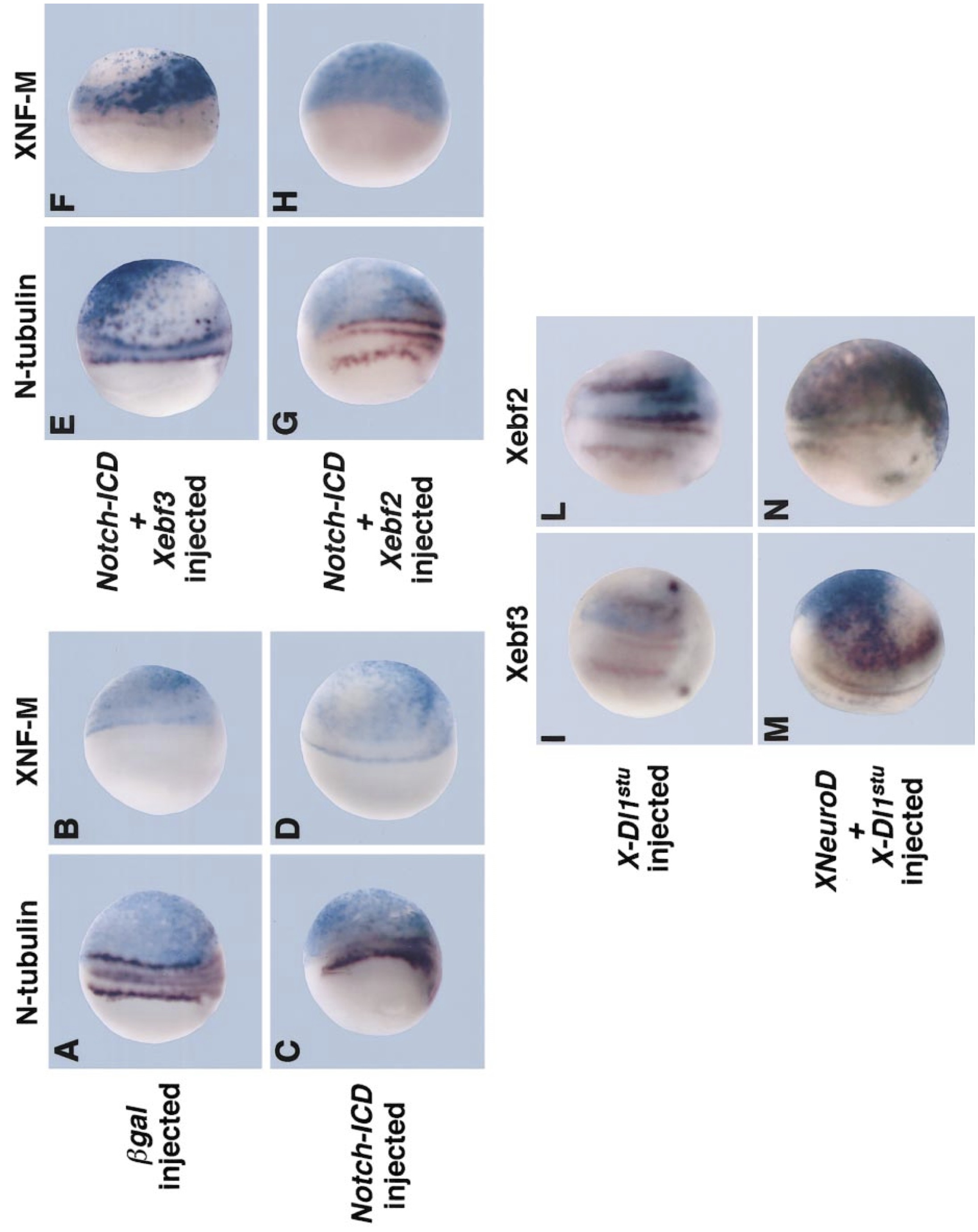 FIG. 7. Xebf3 is insensitive to Delta/Notch-mediated lateral inhibition mechanism. Embryos were injected with RNA at the two-cell stage then collected at neural plate stages and assayed by in situ hybridization for expression of the neural markers N-tubulin and XNF-M, and of Xebf3 and Xebf2/Xcoe2, as indicated at the top. Injected embryos are oriented with their anterior side down (dorsal view, injected side revealed by X-gal staining). Overexpression of an activated form of the Notch receptor (Notch-ICD) caused a suppression of N-tubulin expression (C) and no change in XNF-M expression (D) on the injected side. XNF-M is normally turned on at stage 19. Embryos coinjected with Notch-ICD and Xebf3 (E, F) gave a similar pattern of ectopic N-tubulin and XNF-M expression as with Xebf3 alone (see Figs. 4C and 4D), suggesting that Xebf3 function was not inhibited by activated Notch. In contrast, embryos coinjected with Notch-ICD and Xebf2/Xcoe2 showed an inhibition of neurogenesis (G, H), as compared with embryos injected with Xebf2/Xcoe2 alone (Figs. 4E and 4F). The block of the Delta/Notch pathway induced by injecting X-Dl1stu did not influence Xebf3 expression (I) but caused an increase in the Xebf2/Xcoe2-positive neurons within the three stripes of primary neurons (L). When lateral inhibition was similarly blocked in XneuroD-injected embryos, overexpression of XNeuroD promoted ectopic expression of both Xebf3 and Xebf2/Xcoe2 (M, N).